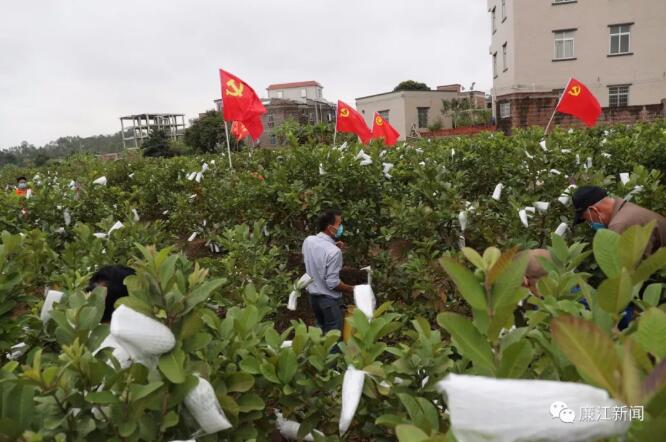在良垌镇中岭村番石榴种植基地里,党旗飘扬,该村的党员们正带领群众采摘新鲜的番石榴。良垌镇新时代文明实践所志愿者获知此消息后也自发前往中岭村协助摘果。采果过程中,大家都是挑质量最好,果实最大的进行采摘。