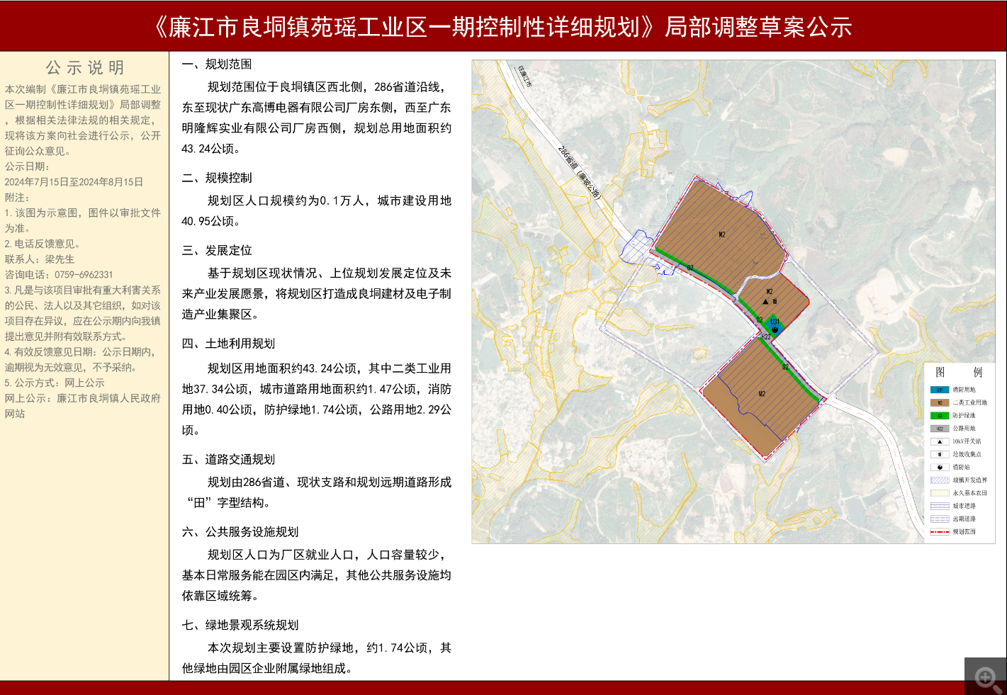 规划范围位于良垌镇区西北侧,286省道沿线东至现状广东高博电器有限公司厂房东侧,西至广东明隆辉实业有限公司厂房西侧,规划总用地面积约43.24公顷。