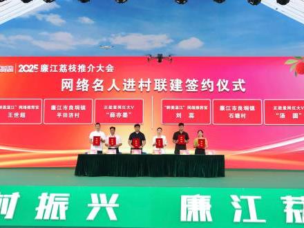 继5月27日首批正能量顶流网红大V与遂溪、吴川3条乡村签订《网络名人进村联建协议》后,5月28日省、湛江市网信部门继续发“荔”,在2025廉江荔枝推介大会上同步举办了网络名人进村联建签约仪式。活动现场,廉江市平田济村和