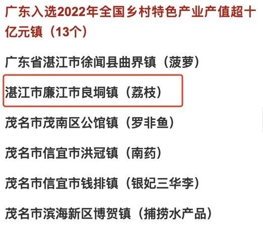 其中,廉江市良垌镇入选,2022年全国乡村特色产业,产值超十亿元镇名单