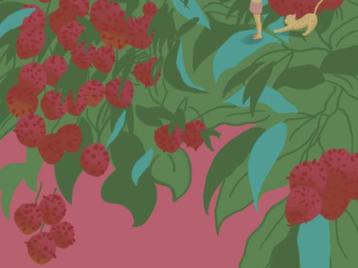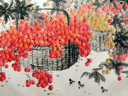 “小笔轻提写荔忙,绵绵彩墨作琼妆。花枝历历遮羞面,惠雨霏霏洗晚霜。童牧箫吹新果满,白头杖索旧篇章。愿得百尺鹅溪绢,扫取红云十里长